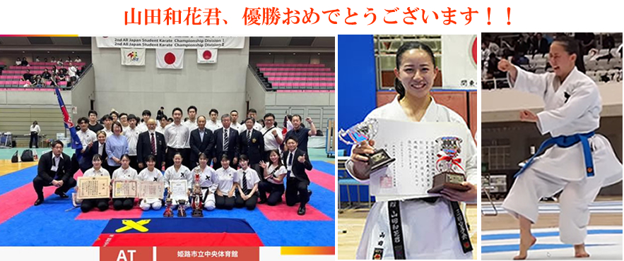 第52回関東学生空手道選手権(東京スポーツ文化会館)女子個人形では、女子主将の山田和花君(4年)が優勝し三連覇を達成、女子個人組手では 1年生の長谷川君が第5位に入賞。山田君(4年)・長谷川君(1年)に加え、西田君(1年)が女子個人組手にて全日本個人に出場となりました。